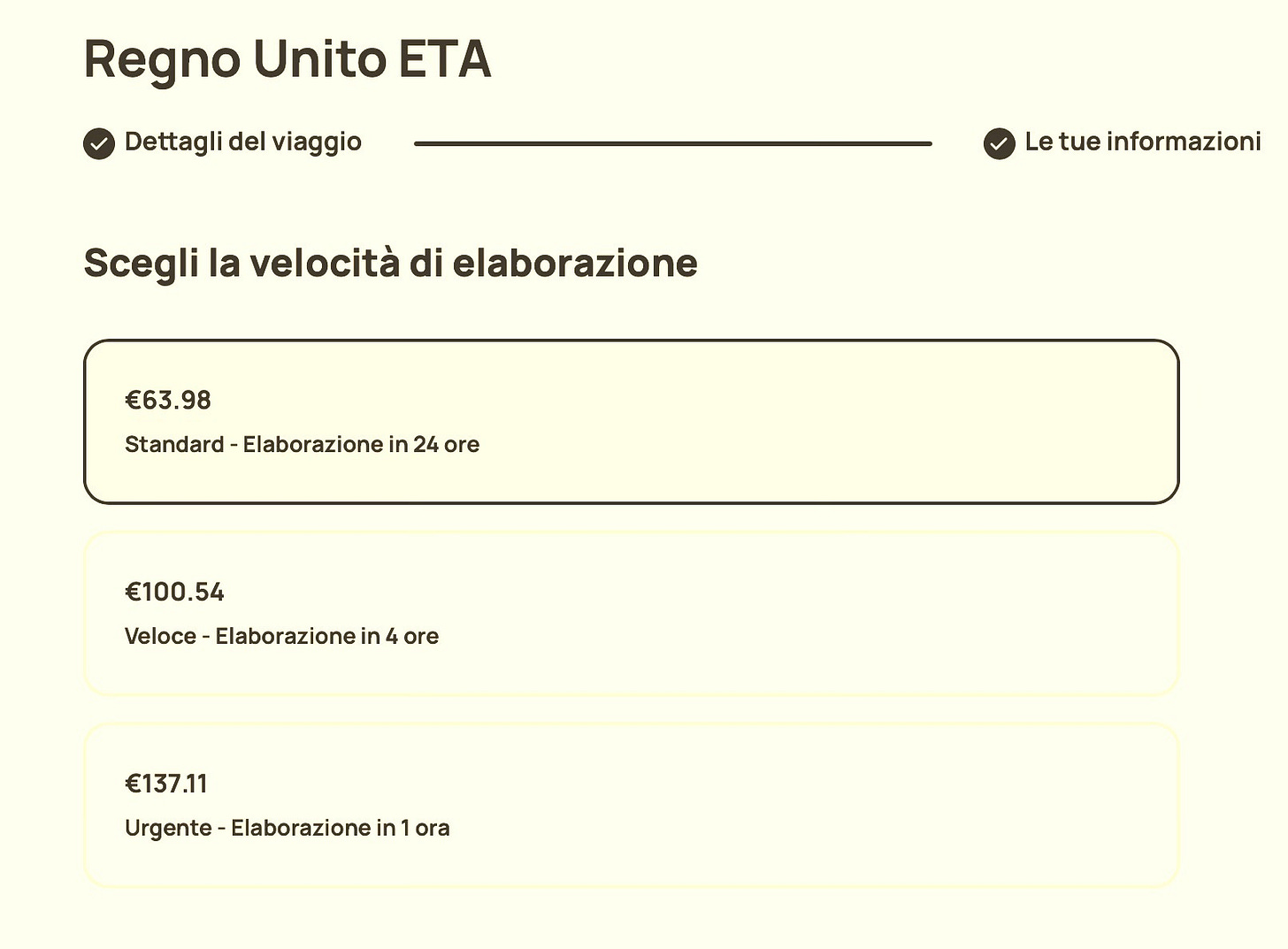 Nel primo di questi (visasyst.com), il costo dell’ETA va da un minimo di US$109 (circa £82), fino a un massimo di US$168 (£126), selezionando l’opzione “priority”. Un servizio di dubbia utilità, considerando che il rilascio dell’ETA è generalmente istantaneo sul sito del governo.