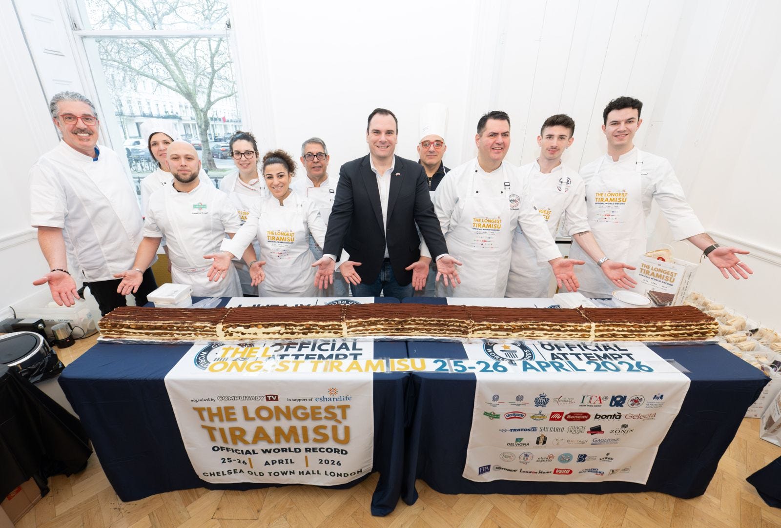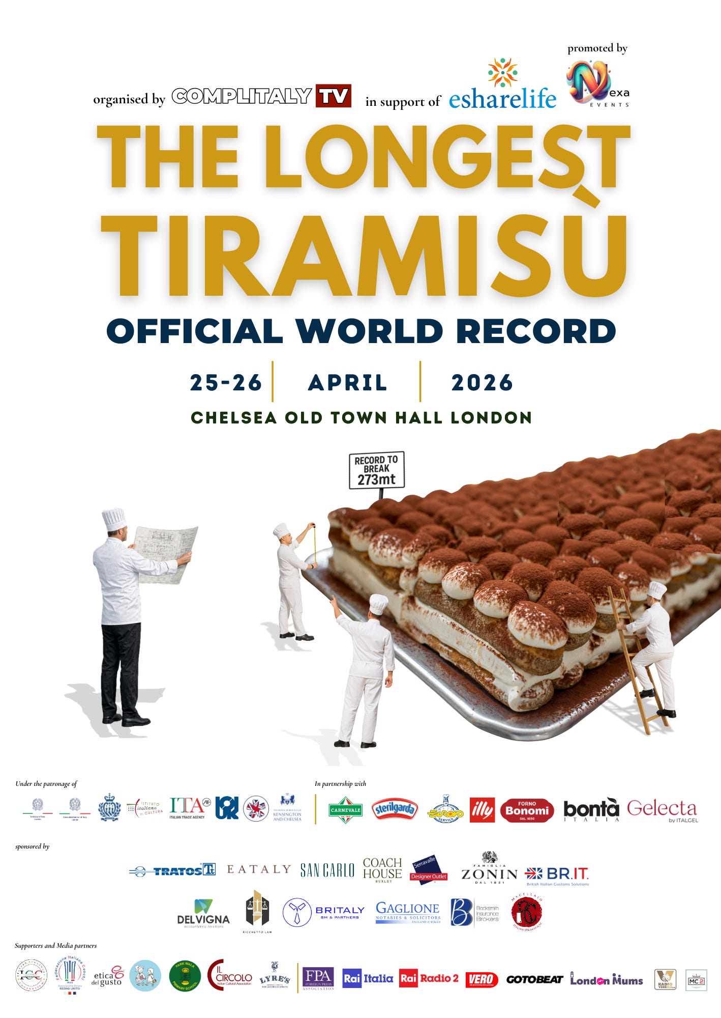 L’evento non è solo una dimostrazione di abilità culinaria, ma una vera e propria celebrazione della cultura italiana nel Regno Unito. L’evento è organizzato da COMPLITALY TV con il patrocinio delle principali istituzioni italiane nel Regno Unito e supportato da varie aziende private. A guidare le operazioni ci saranno i professionisti dell’APCI UK l'Associazione Professionale Cuochi Italiani divisione del Regno Unito, insieme a tanti ospiti d’eccezione, compreso Giuseppe Dell’Anno, vincitore di The Great British Bake Off, che metterà la sua maestria al servizio di questa titanica impresa. Anche il maestro pasticcere Iginio Massari giungerà a Londra quei giorni per seguire l’evento.
